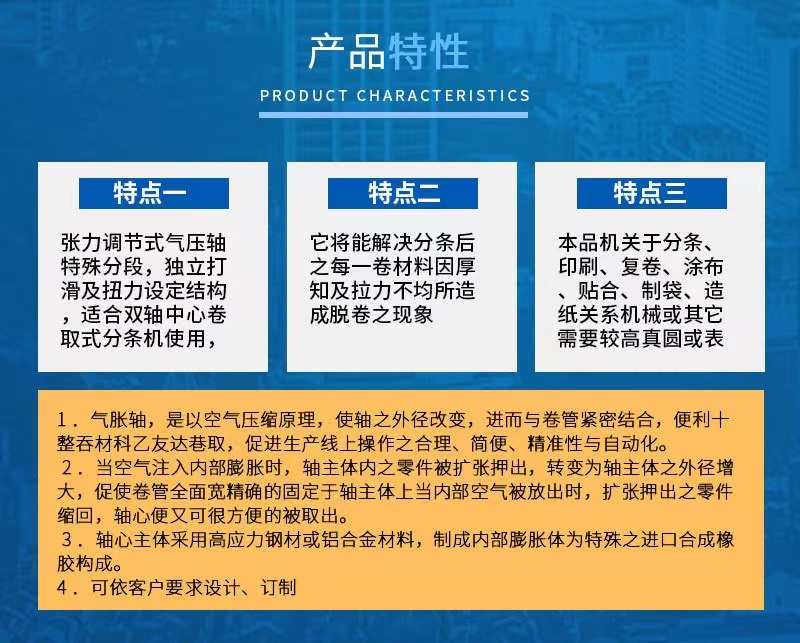 科妙公司主營產(chǎn)品有:凸鍵式氣脹軸(又稱千島式、鍵條式),瓦片式氣脹軸(又稱板條式),通鍵式氣脹軸(又稱條形式),機(jī)械式脹軸,氣動(dòng)式機(jī)械軸,圓柱式氣脹軸,表面回轉(zhuǎn)式氣脹軸,表面脹氣氣脹軸,3'脹6'-12'等夾套、氣壓夾頭、機(jī)械夾頭、安全夾頭等。主要規(guī)格(英寸)有:1”、1.5”、2”、2.5”、3”、4”、5”、6”、8”、9”、10”、12、14”、15”、16”、18”、19”、20”、